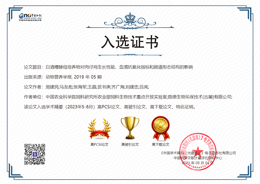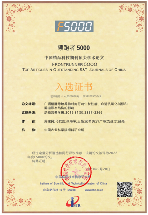 公司與中國農(nóng)業(yè)科學(xué)院飼料研究所家禽營養(yǎng)與飼料創(chuàng)新團隊共同完成并發(fā)表于《動物營養(yǎng)學(xué)報》(2019,31(5): 2357-2366)的學(xué)術(shù)論文—《白酒糟酵母培養(yǎng)物對肉仔雞生長性能、血清抗氧化指標和腸道形態(tài)結(jié)構(gòu)的影響》,入選2022年度“領(lǐng)跑者5000—中國精品科技期刊頂尖學(xué)術(shù)論文(F5000)”和學(xué)術(shù)精要(2023年5-6月)高PCSI論文、高被引論文和高下載論文。